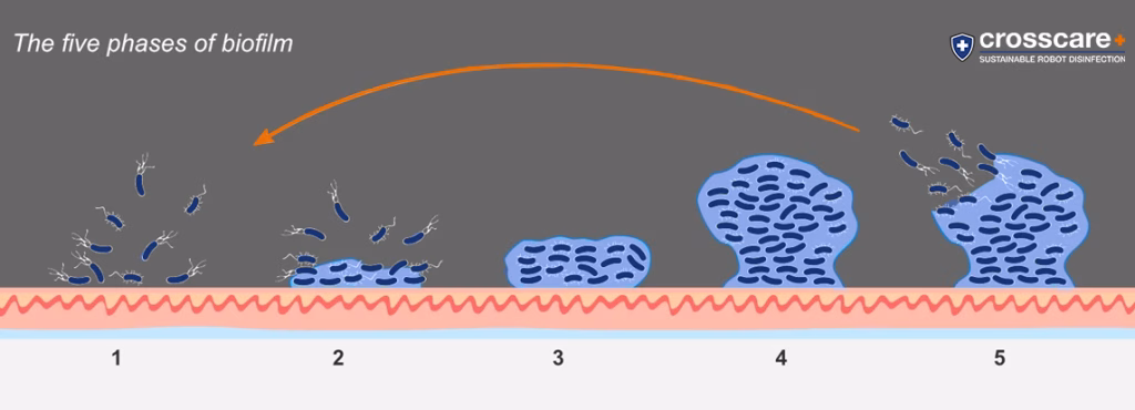 Biofilm is een samenhangende laag van micro-organismen die zich hechten aan oppervlakken in vochtige omgevingen, zoals leidingen, tanks en installaties. Deze micro-organismen worden ingesloten in een matrix, waardoor zij beschermd zijn tegen verscheidene soorten desinfectie en reiniging.